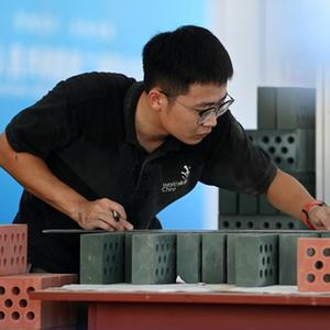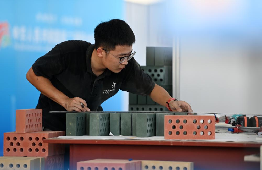 2023年9月17日,在国家会展中心(天津)举办的中华人民共和国第二届职业技能大赛进入第二天,参赛选手在参加砌筑项目比赛。新华社记者 赵子硕 摄