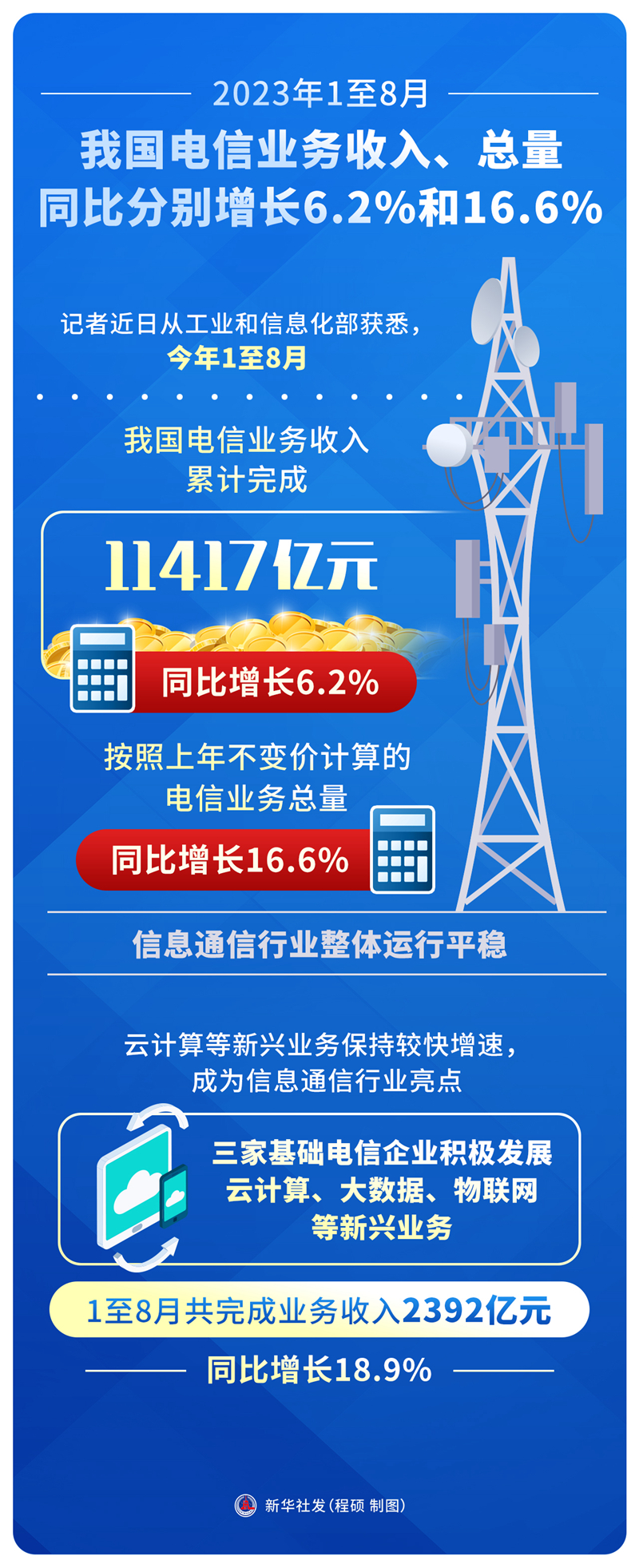 新华社北京9月30日电(记者张辛欣)记者近日从工业和信息化部获悉,今年1至8月,我国电信业务收入累计完成11417亿元,同比增长6.2%,按照上年不变价计算的电信业务总量同比增长16.6%,信息通信行业整体运行平稳。