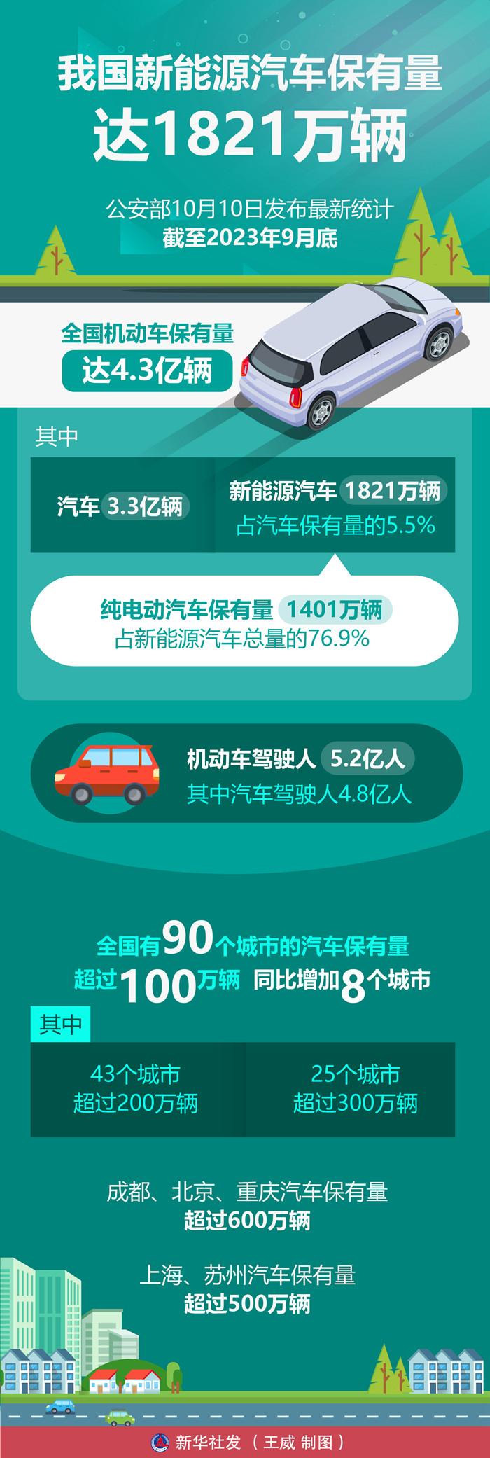 新华社北京10月10日电(记者任沁沁)公安部10日发布最新统计,截至2023年9月底,全国机动车保有量达4.3亿辆,其中汽车3.3亿辆,新能源汽车1821万辆;机动车驾驶人5.2亿人,其中汽车驾驶人4.8亿人。