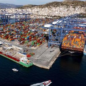 图为2022年2月19日拍摄的希腊比雷埃夫斯港集装箱3号码头(无人机照片)。作为“一带一路”倡议的典范项目,希腊比雷埃夫斯港年货物吞吐量增至500万标箱以上,跃升为欧洲第四大集装箱港口、地中海领先集装箱大港。新华社发(中远海运港口比雷埃夫斯码头有限公司供图)