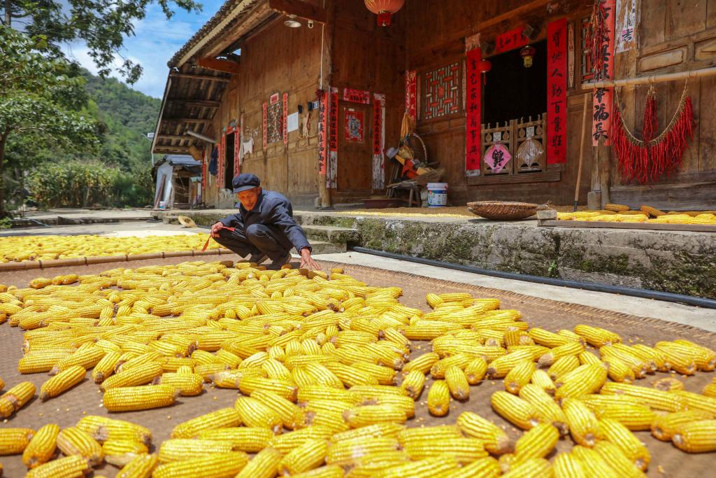 黔东南州施秉县牛大场镇石桥村村民在晾晒玉米。(磨桂宾 摄)