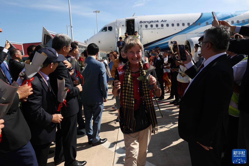 10月16日,在柬埔寨暹粒吴哥国际机场,首架进港客机乘客受到夹道欢迎。新华社发
