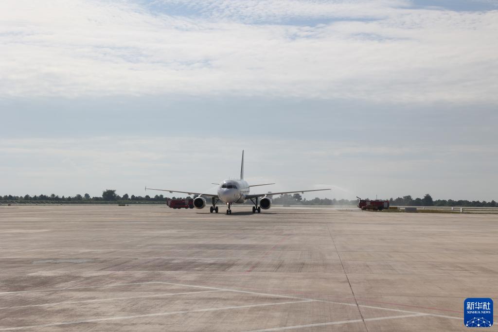 10月16日,在柬埔寨暹粒吴哥国际机场,首架进港客机降落后通过水门。新华社发