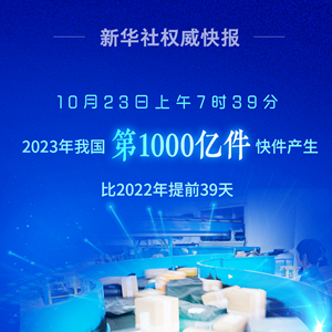 新华社北京10月23日电(记者戴小河)记者从国家邮政局获悉,23日上午7时39分,2023年我国第1000亿件快件产生,比2022年达到千亿件提前39天,彰显我国经济持续向好的强劲动力。
