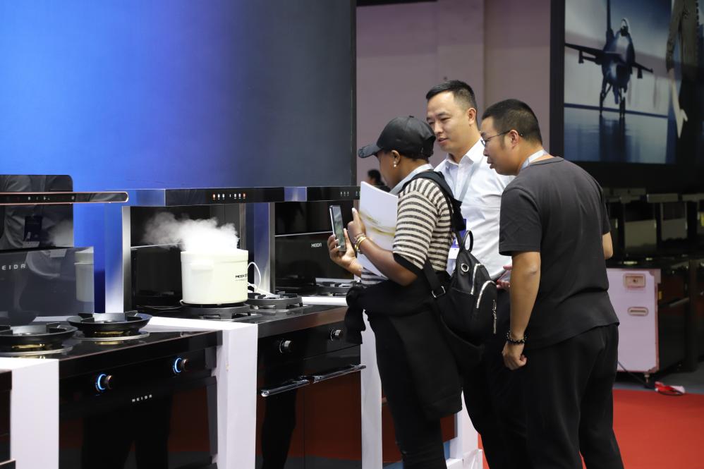 浙江美大实业股份有限公司工作人员为到会客商介绍集成灶功能。新华社记者张晓洁 摄