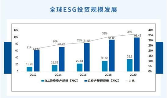 近些年来,ESG投资在资本市场的热度不断提高。全球可持续投资联盟(Global Sustainable Investment Alliance,简称GSIA)发布的《2020年全球可持续投资报告》显示,ESG投资的资产规模逐年扩大,2020年就已占到了全球总资产管理规模的36%。