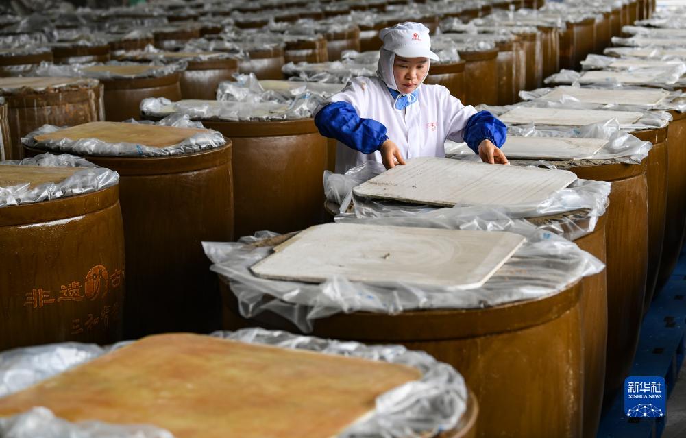 10月23日,重庆丰都三和实业有限公司工作人员在检查榨菜装坛密封情况。新华社记者 王全超 摄
