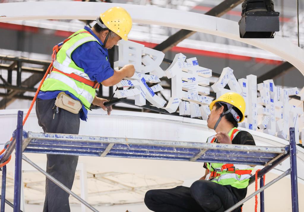 工作人员在国家会展中心(上海)内部布展施工(10月29日摄)。新华社记者丁汀摄