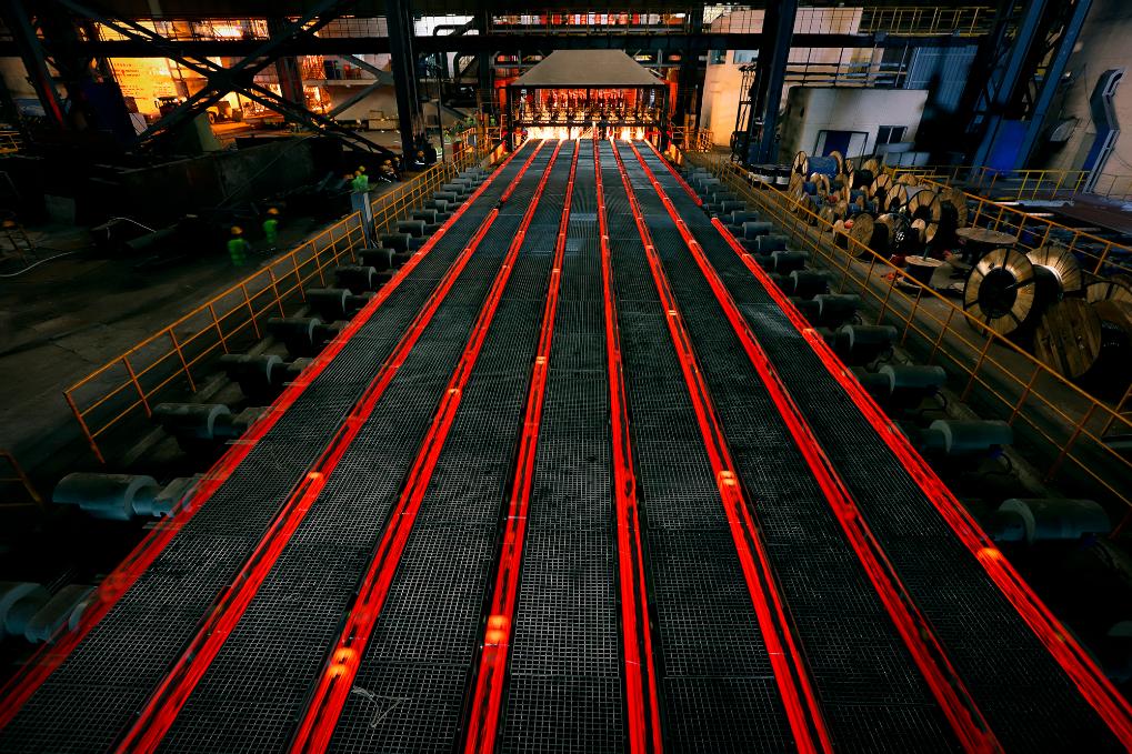 火花飞溅,机器轰鸣,新天钢集团天钢公司的生产车间里,炽红的钢材在产线上不断前进。