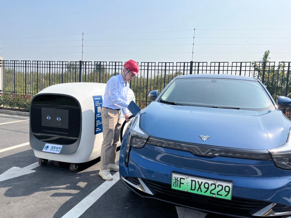 图为智能移动充电机器人为排队等候的新能源汽车提供充电服务。新华社发(沈佳炜摄)