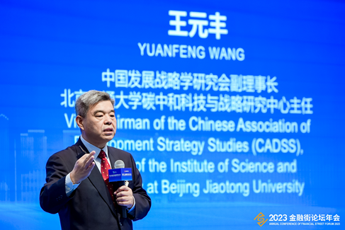 图为中国发展战略学研究会副理事长、北京交通大学碳中和科技与战略研究中心主任王元丰在“2023金融街论坛年会”——“践行ESG理念 金融科技助推高质量发展”平行论坛上作主题演讲