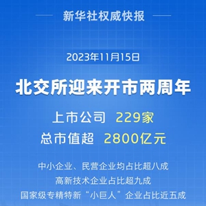 经过两年发展,北交所上市公司数量增至229家,总市值超2800亿元。其中,中小企业、民营企业均占比超八成,高新技术企业占比超九成,国家级专精特新“小巨人”企业占比近五成。