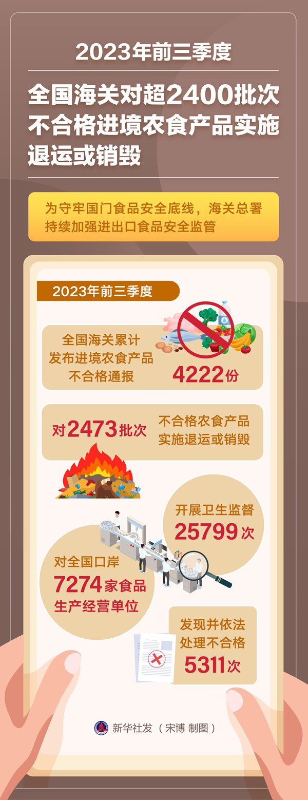 新华社长沙11月22日电(记者邹多为)为守牢国门食品安全底线,海关总署持续加强进出口食品安全监管。今年前三季度,全国海关累计发布进境农食产品不合格通报4222份,对2473批次不合格农食产品实施退运或销毁;对全国口岸7274家食品生产经营单位开展卫生监督25799次,发现并依法处理不合格5311次。
