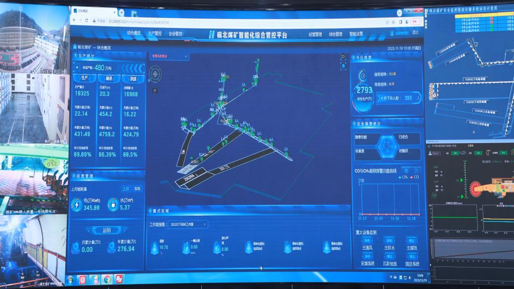 在砚北煤矿安全生产智能调度指挥中心内,调度员紧盯眼前屏幕实时显示的生产数据,通过该智能化综合管控平台,对10公里外、600米深的矿井一线工作面进行在线监测、远程控制。