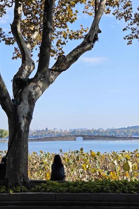 11月22日,西湖北山街,一位游客坐在湖边欣赏秋日断桥。新华社记者 黄宗治 摄