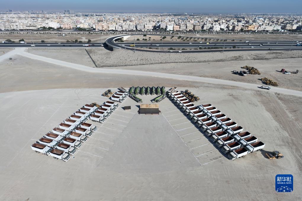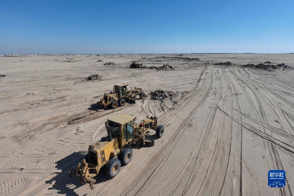 这是12月4日在科威特杰赫拉省南萨阿德阿卜杜拉新城基础设施项目施工现场拍摄的工程机械设备(无人机照片)。新华社发(陈此超摄)