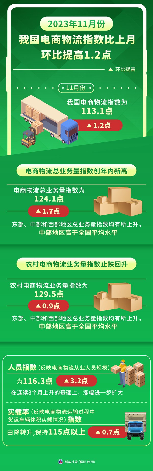 新华社北京12月5日电(记者叶昊鸣)记者5日从中国物流与采购联合会获悉,11月份我国电商物流指数为113.1点,比上月环比提高1.2点。
