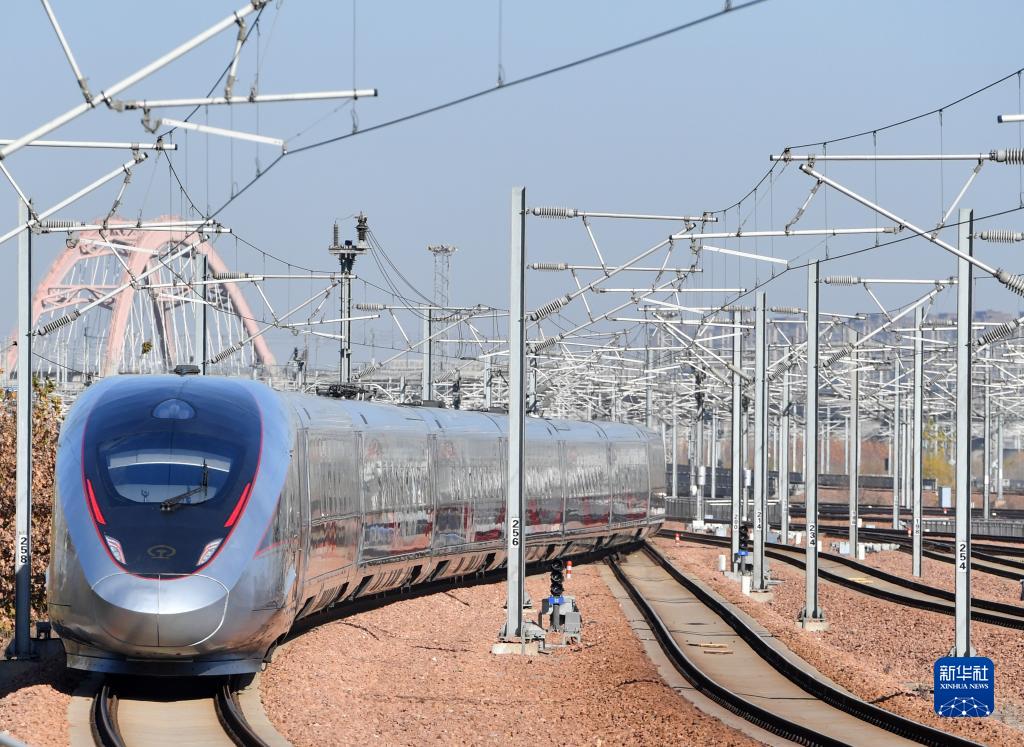 12月8日,列车驶过济郑高铁长清黄河铁路特大桥(无人机照片)。新华社记者 邢广利 摄