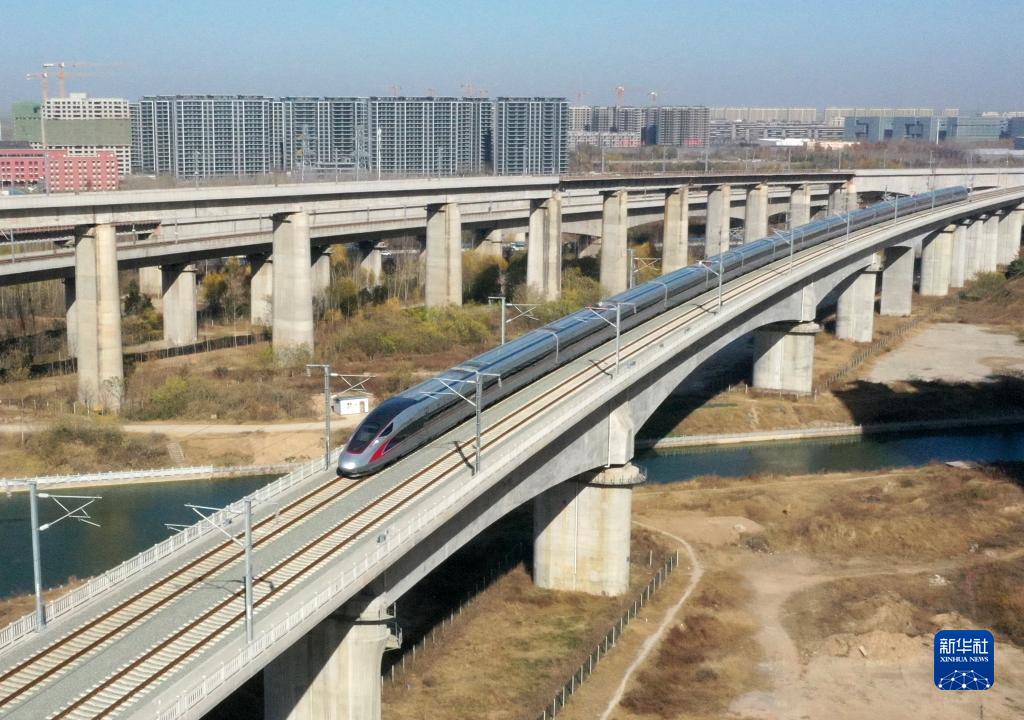 12月8日,在郑州市东三环附近,列车行驶在济郑高速铁路上(无人机照片)。新华社记者 李嘉南 摄