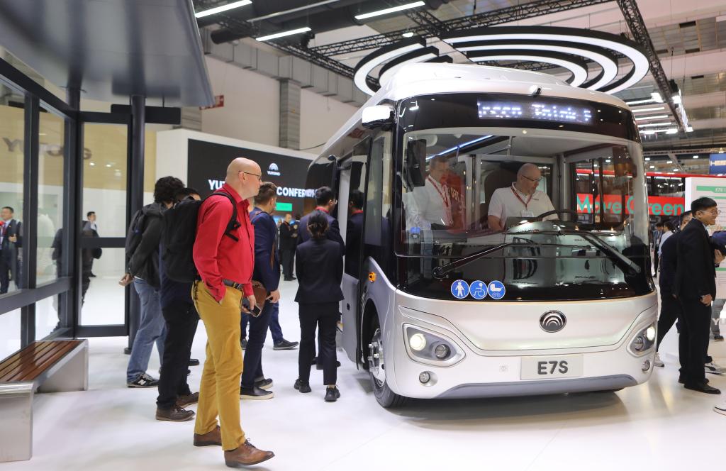 这是2023年10月7日在比利时布鲁塞尔举行的世界客车博览会上拍摄的宇通电动巴士展示现场。新华社记者潘革平摄
