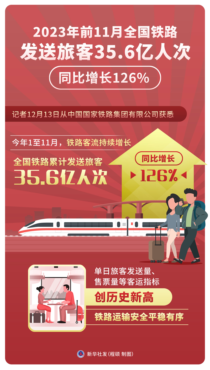 新华社北京12月13日电(记者樊曦)记者13日从中国国家铁路集团有限公司获悉,今年1至11月,铁路客流持续增长,全国铁路累计发送旅客35.6亿人次,同比增长126%,单日旅客发送量、售票量等客运指标创历史新高,铁路运输安全平稳有序。