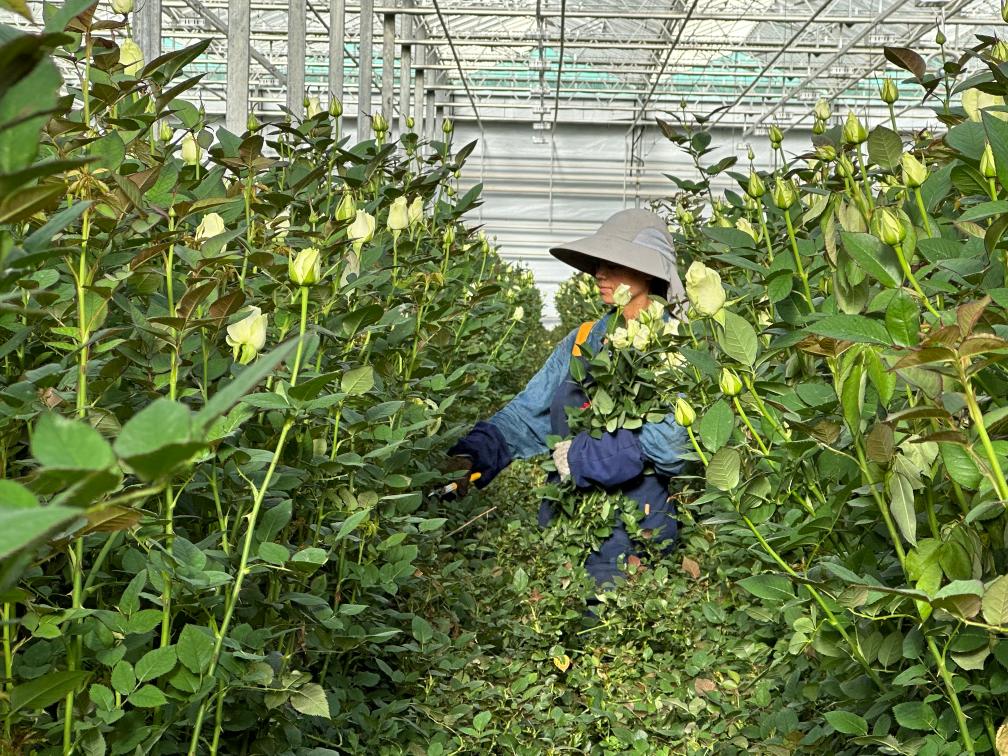脱去厚重的外套,张小红换上轻便的工作服,戴好手套和帽子,拿起大剪刀,开始了一天的剪花工作。只见她走进幽深窄密的绿色长廊,直到看不见人影。少许时刻,她便抱着一大捧玫瑰走了出来,新鲜的露水从娇嫩的花瓣上滴落。平板车里盛满清水,她和其他工人们一起,将新鲜采摘的玫瑰用网纱细心地裹好,然后放置水中。再过不久,这些玫瑰将被运往全国各地甚至海外,为人们带来愉悦和享受。