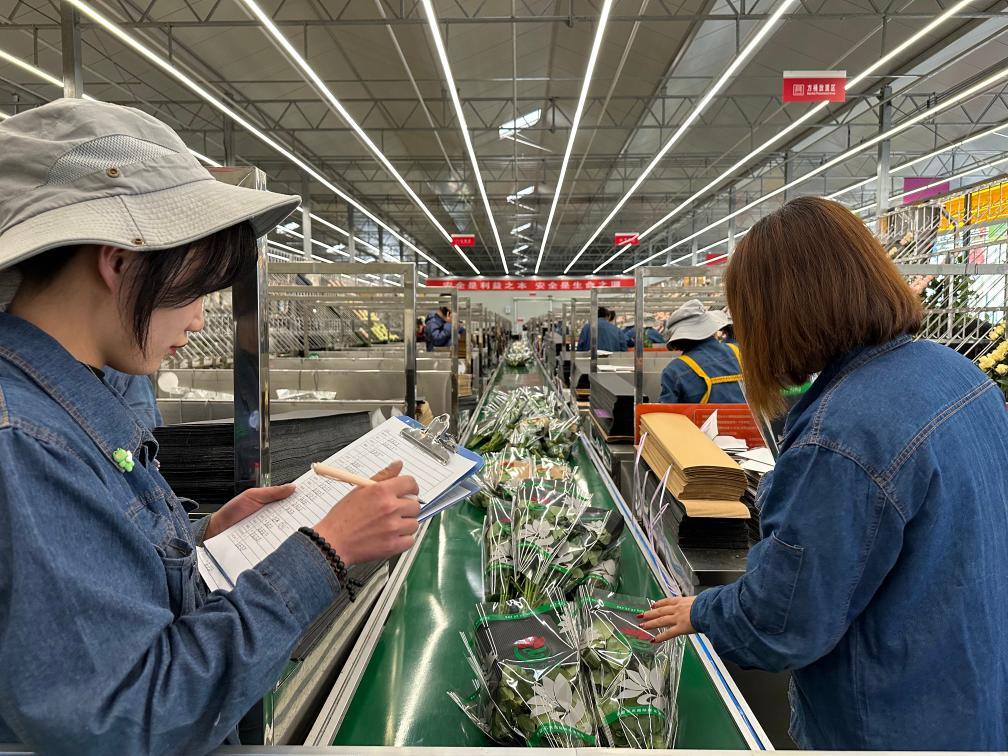 张小红的同事在鲜花港玫瑰工厂包装玫瑰。 新华社记者 胡伟杰 摄