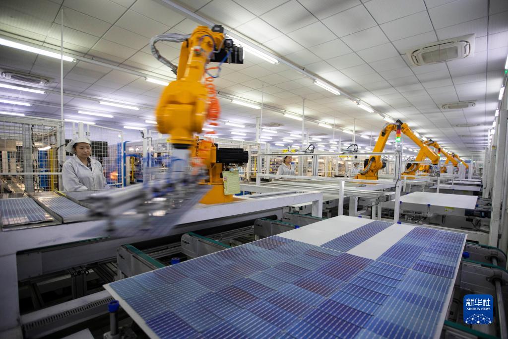 在山东省东营市广饶县的东营大海科林光电有限公司智能化太阳能组件生产车间,工人在调试设备,生产出口的光伏组件(2023年2月24日摄)。新华社发(刘云杰 摄)