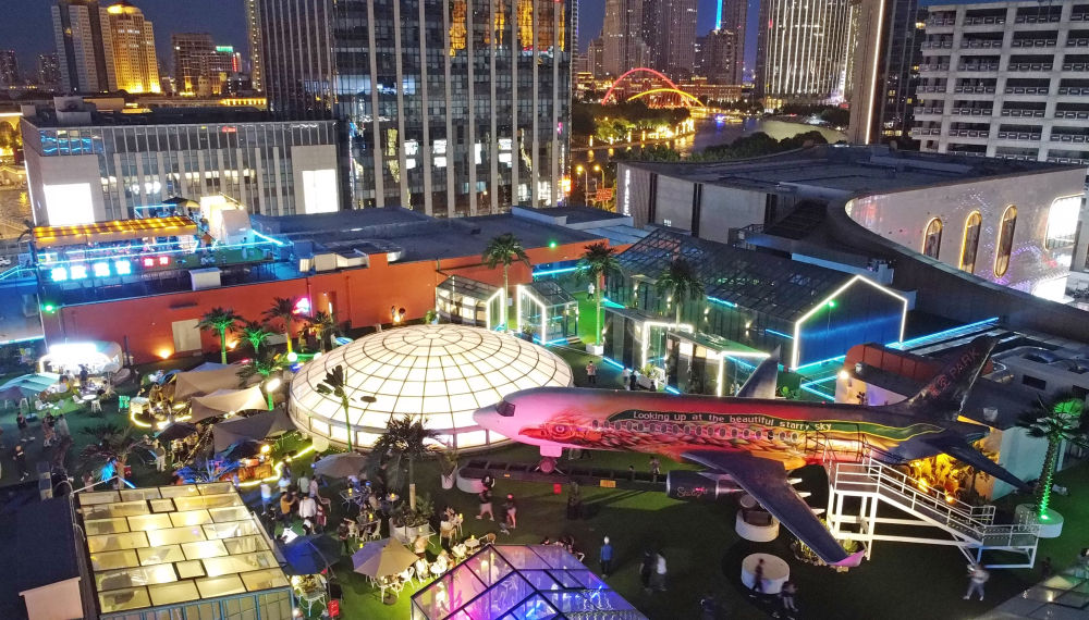 市民在天津市和平区金街商圈的“印象城”楼顶休闲游玩(6月2日摄,无人机照片)。新华社记者 赵子硕 摄
