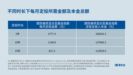 我们继续以定投偏债混合型基金指数代表定投偏债混合型基金,Wind数据显示,该指数自2013年以来近10个完整年度的年化收益率为7.0%。同时,我们设定20万为预期的收益目标,也就是到期本息和。
