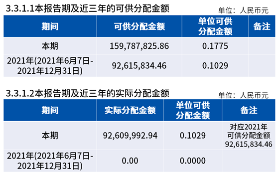 另外,我们还可以读到,2022年该公募REITs的可供分配金额接近1.6亿元,但未在2022年期间对该笔金额进行分配。进一步结合分红公告,该公募REITs在2022年年报披露后不久对该笔金额进行了分配,分红比例同样接近100%。