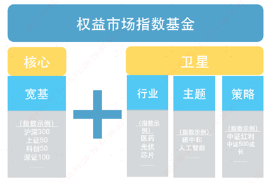核心卫星策略和指数基金怎么搭档呢?可以这样考量:对于“核心”资产主要采用配置策略,注重长期持有;而对于“卫星”资产主要采用轮动策略,根据市场变化进行灵活调整。以股票型指数基金为例: