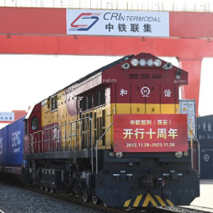2023年11月28日,X8155次中欧班列在西安国际港站等待出发,将开往德国汉堡。(新华社记者邹竞一摄)
