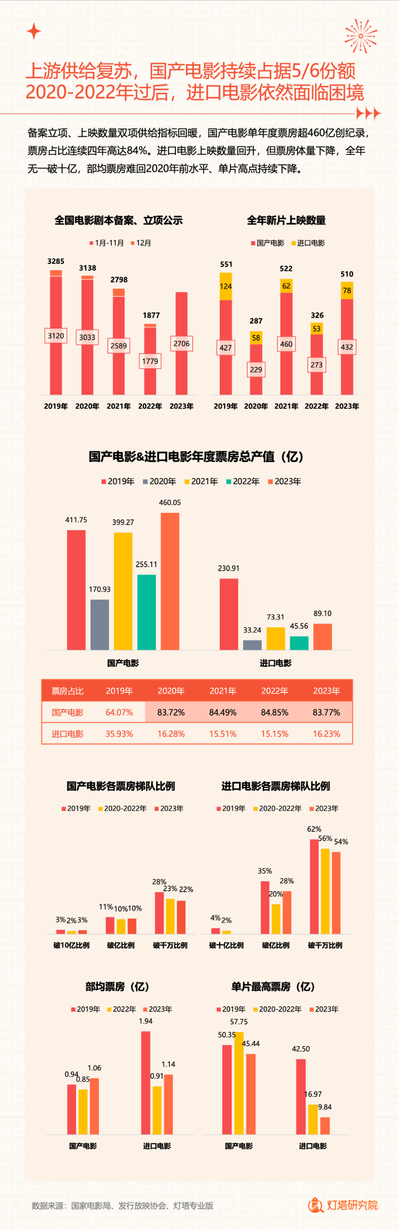 根据国家电影局1日公布数据,2023年全年电影票房为549.15亿元,其中国产影片票房为460.05亿元,占比为83.77%;城市院线观影人次为12.99亿。 全年票房过亿元影片共73部,其中国产影片50部,票房排名前10位均为国产影片。