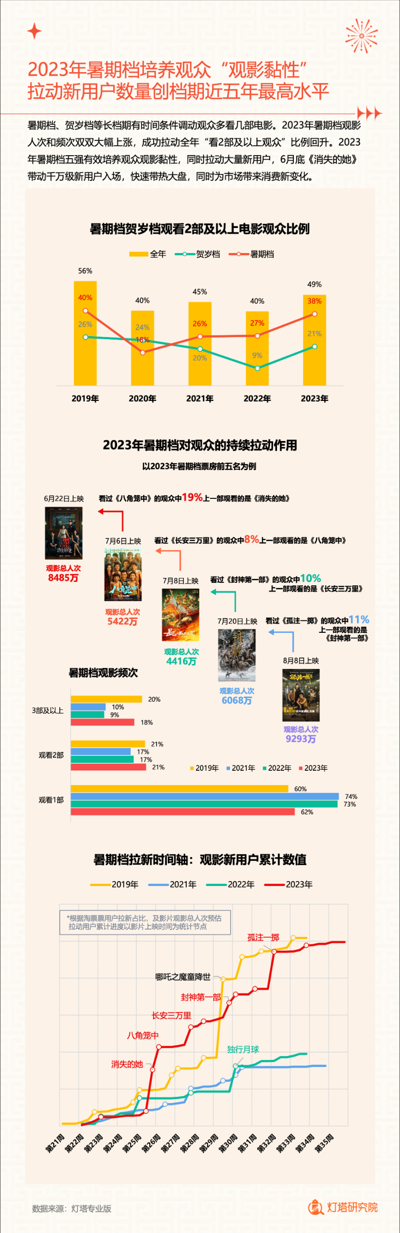报告显示,2023年票房相比过去三年大幅上涨七成、恢复至2017年水平,人次上涨六成,人均观影频次升至2.58次,预估全年城市院线观影总人数再度突破5亿大关。相比2020-2022年,中高频观影用户均有显著提升,相比2019年更多平时较少观影的低频用户走进电影院。