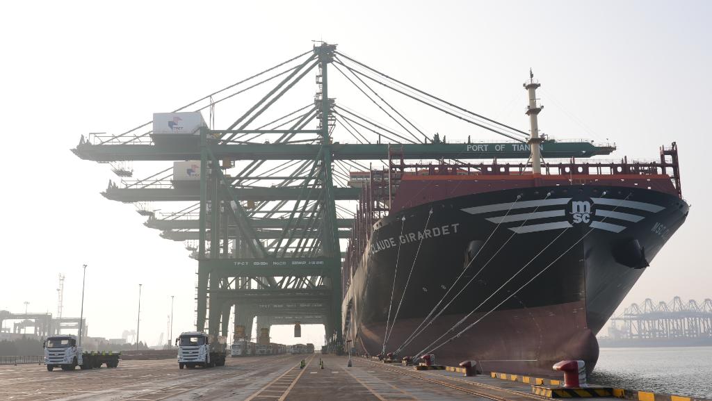 “地中海·克劳德吉拉德特”轮的靠泊,开启了2024年港口的忙碌。天津港数据显示,仅1月1日,全港就有近百艘船在泊,5000多名员工在一线提供保障。