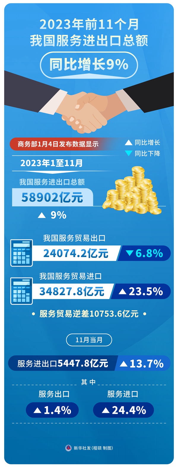 数据显示,2023年1至11月,我国服务贸易出口24074.2亿元,同比下降6.8%;进口34827.8亿元,同比增长23.5%;服务贸易逆差10753.6亿元。11月当月,服务进出口5447.8亿元,同比增长13.7%;其中服务出口同比增长1.4%,进口同比增长24.4%。