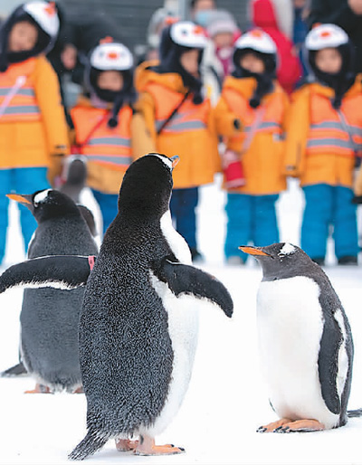 1月6日,在哈尔滨极地公园,来自广西壮族自治区南宁市的小朋友——“小砂糖橘”与企鹅进行互动。新华社记者 张 涛摄