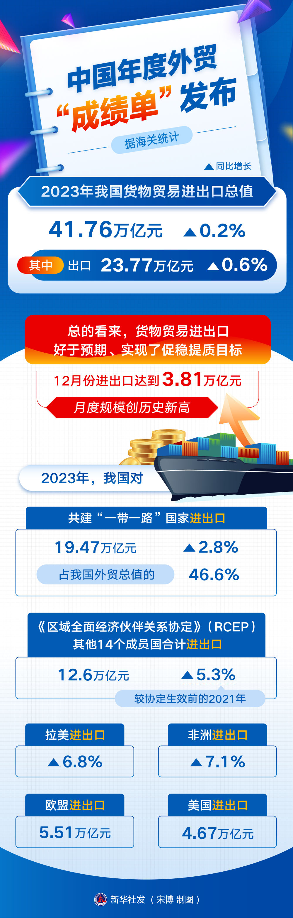 中国年度外贸“成绩单”1月12日发布。据海关统计,2023年我国货物贸易进出口总值41.76万亿元,同比增长0.2%。其中,出口23.77万亿元,同比增长0.6%,不仅在高基数上再创新高,增长动能也得到质的有效提升。