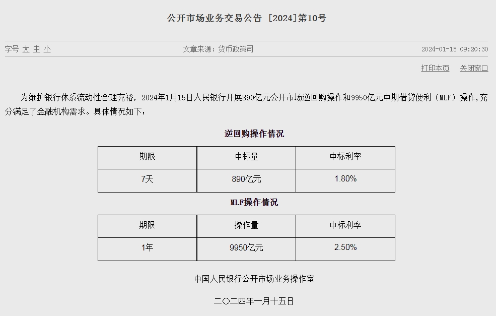 为维护银行体系流动性合理充裕,1月15日中国人民银行开展890亿元公开市场逆回购操作和9950亿元中期借贷便利(MLF)操作,充分满足了金融机构需求。