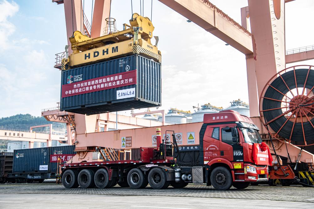 2024年1月4日,西部陆海新通道中老铁路首趟保税进口粮食直达专列到达重庆。新华社记者唐奕 摄