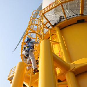 检修人员正要爬上海上风力发电机组,以进入其内部。(汤博文摄)