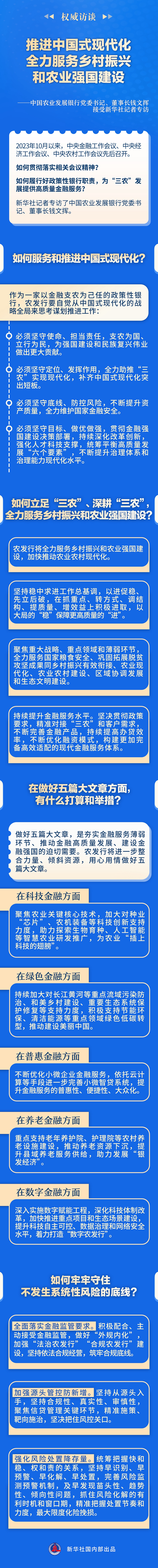 2023年10月以来,中央金融工作会议、中央经济工作会议、中央农村工作会议先后召开。如何贯彻落实相关会议精神?如何履行好政策性银行职责,为“三农”发展提供高质量金融服务?新华社记者专访了中国农业发展银行党委书记、董事长钱文挥。