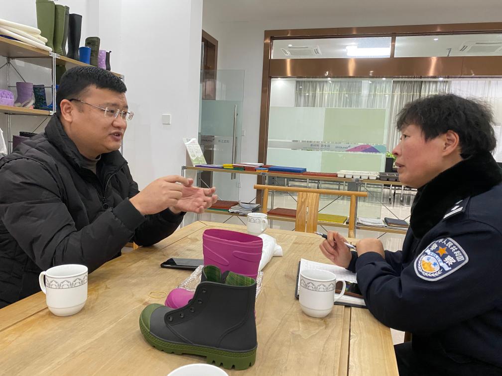 浦口派出所民警相远芳(右一)上门与当地一家新材料企业相关负责人座谈。新华社记者马剑 摄