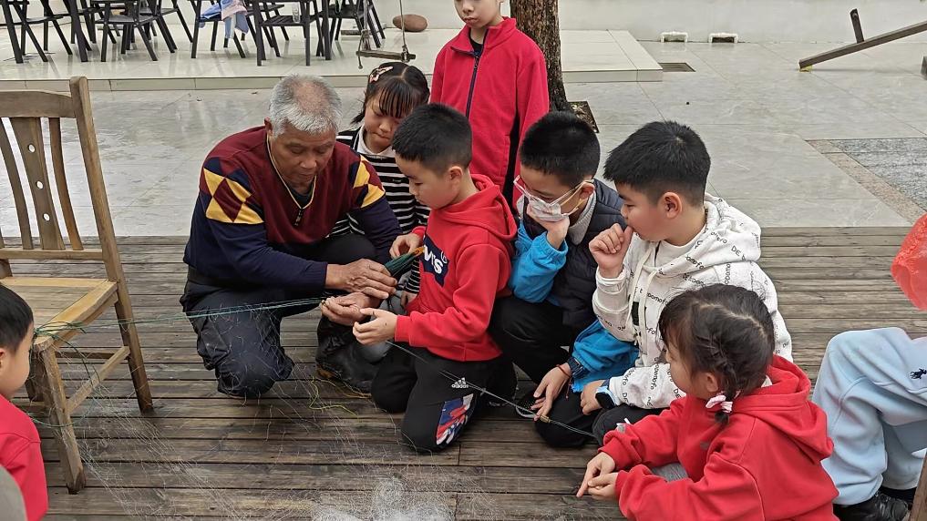 小朋友们在体验京族传统渔网织造技术。新华社记者黄凯莹 摄