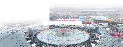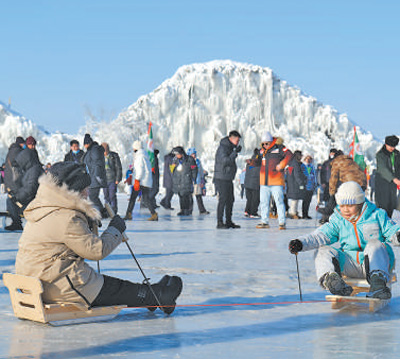 游客在查干湖冰面上体验冰雪那达慕项目。王佳亮摄