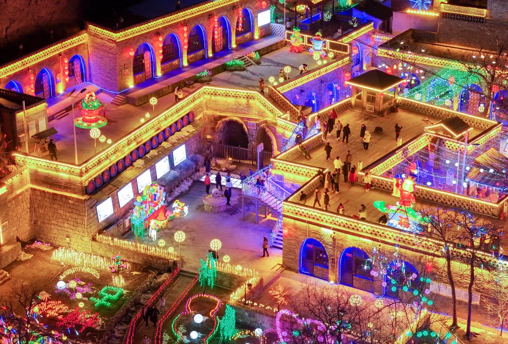 2月11日晚,村民与游客在山西省晋中市平遥县段村镇横坡村观赏民俗彩灯(无人机照片)。新华社发(梁生仁摄)