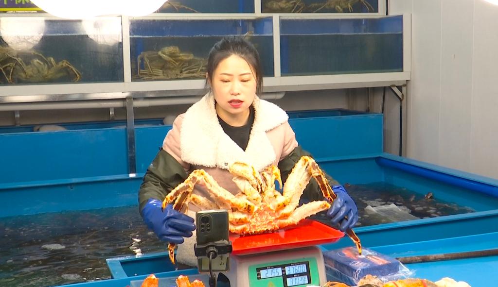 珲春江月水产负责人王楷超说,“我们的螃蟹有一定的优势,因为它是从俄罗斯进入到国内的第一站,价格有很大的优势。扇贝、北极贝、马贝都有挺好的销量。”