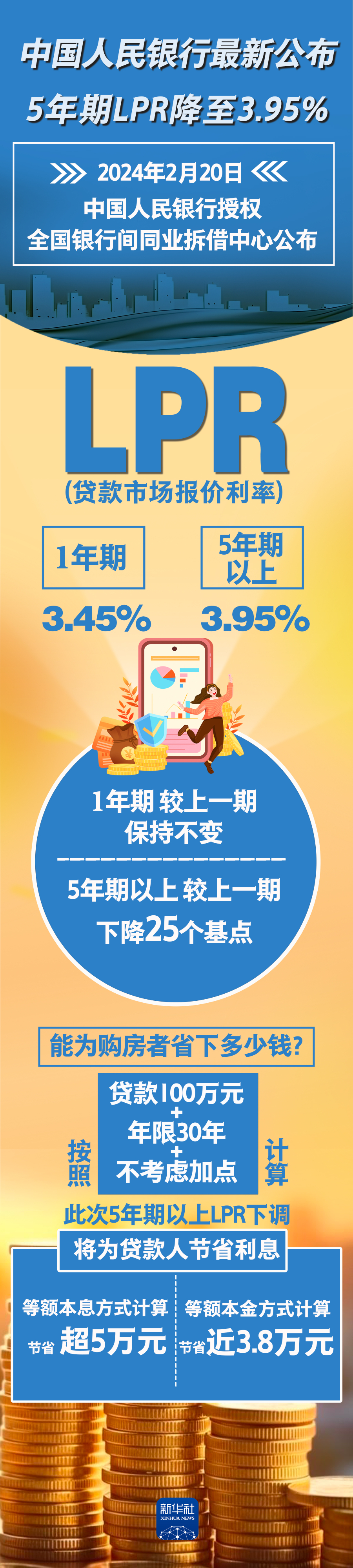 2月20日,龙年开工第三天,中国人民银行授权全国银行间同业拆借中心公布,5年期LPR(贷款市场报价利率)降至3.95%,下降25个基点。这几个看似生僻的字母背后,可为购房者省下一笔还款利息,与许多人的钱袋子息息相关。通过这张图,一起来看看。