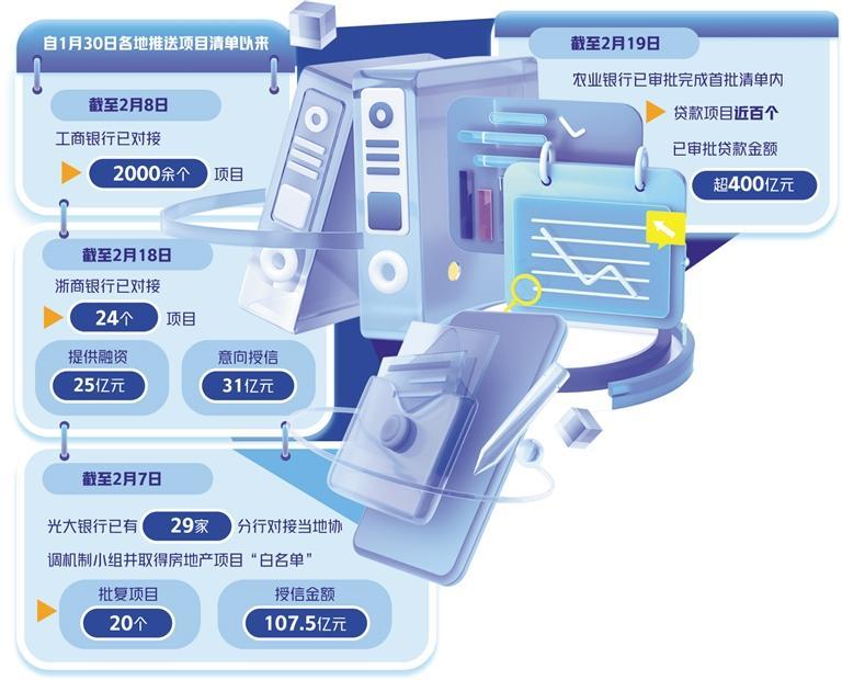 1月30日,重庆市住房和城乡建设委员会、国家金融监督管理总局重庆监管局向金融机构联合推送了重庆市第一批房地产项目“白名单”。“农行重庆市分行积极落实,立即组织分析清单内的全量项目,加快审批流程,缩短审批时间。”中国农业银行重庆市分行相关负责人说,2月1日该行已审批通过开发贷款3.2亿元,期限5年,首笔资金5450万元已于2月4日投放到位,主要用于企业支付工资和工程款项。截至2月19日,农业银行已审批完成首批清单内贷款项目近百个,已审批贷款金额超400亿元,率先在重庆、安徽、浙江、广西、陕西、江苏、新疆多地实现贷款的首笔投放。